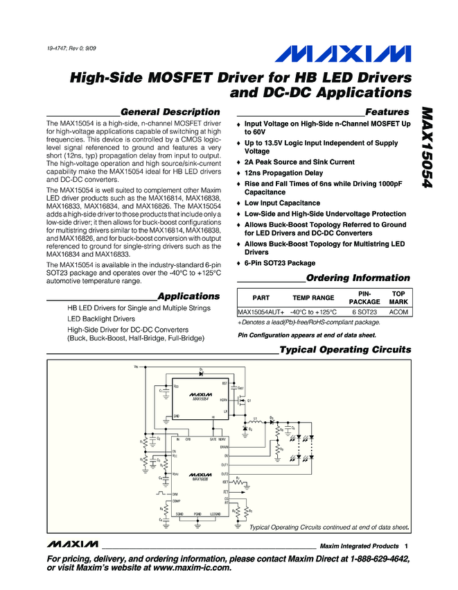 MAX15054 High-Side MOSFET Driver for HB LED Drivers and DC-DC Applications