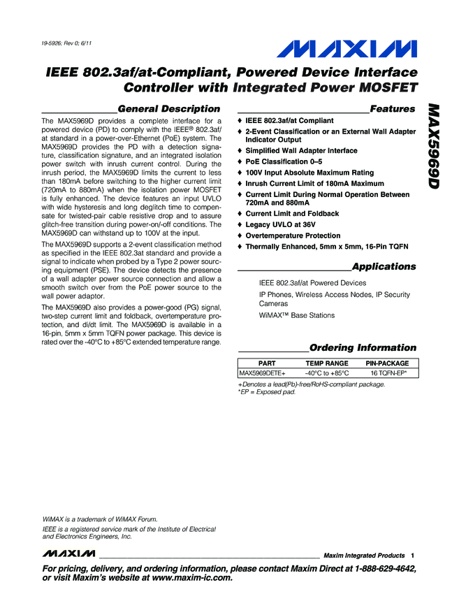 MAX5969D IEEE 802.3af/at-Compliant, Powered Device Interface Controller with Integrated Power MOSFET
