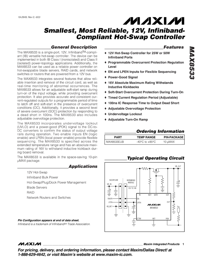 MAX8533 Smallest, Most Reliable, 12V, InfiniBand-Compliant Hot-Swap Controller
