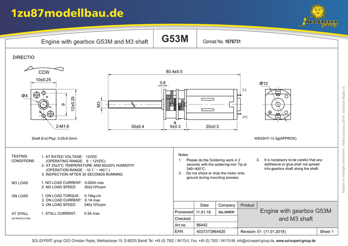 Mikro motoreduktor Sol Expert 96442 1:53 50 - 450 U/min