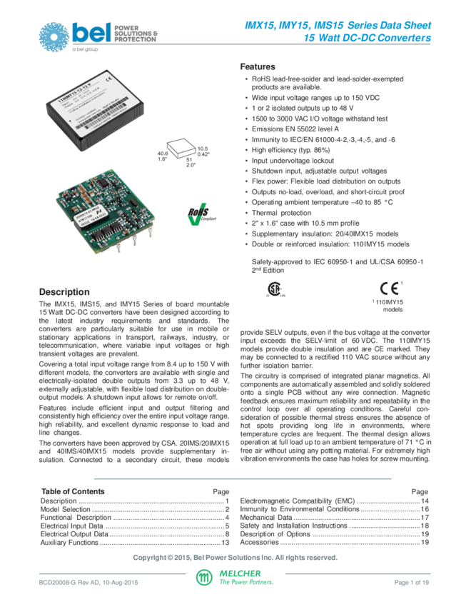 Converter, DC-DC, Board-mountable, 15W, 20Vdc in, Dual 24Vdc/0.32A Out, -40°C~+85°C, RoHS, for mobile applications
