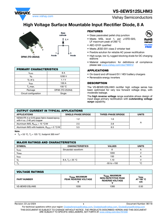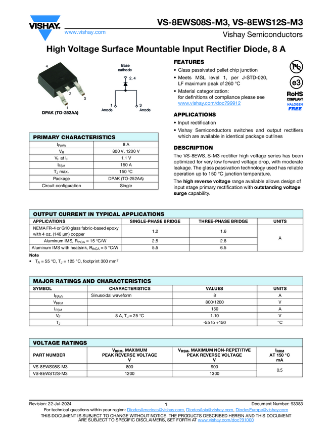 High Voltage Surface Mountable Input Rectifier Diode, 8 A