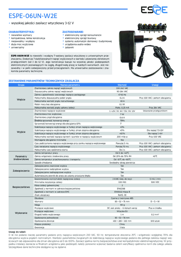 Zasilacz uniwersalny ESPE 3V 4.5V 5V 6V 7.5V 9V 12VDC 600mA | ESPE-06UN-W2E-MP