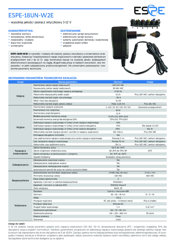 Zasilacz uniwersalny ESPE 3V 4.5V 5V 6V 7.5V 9V 12VDC 1500mA | ESPE-18UN-W2E-MP