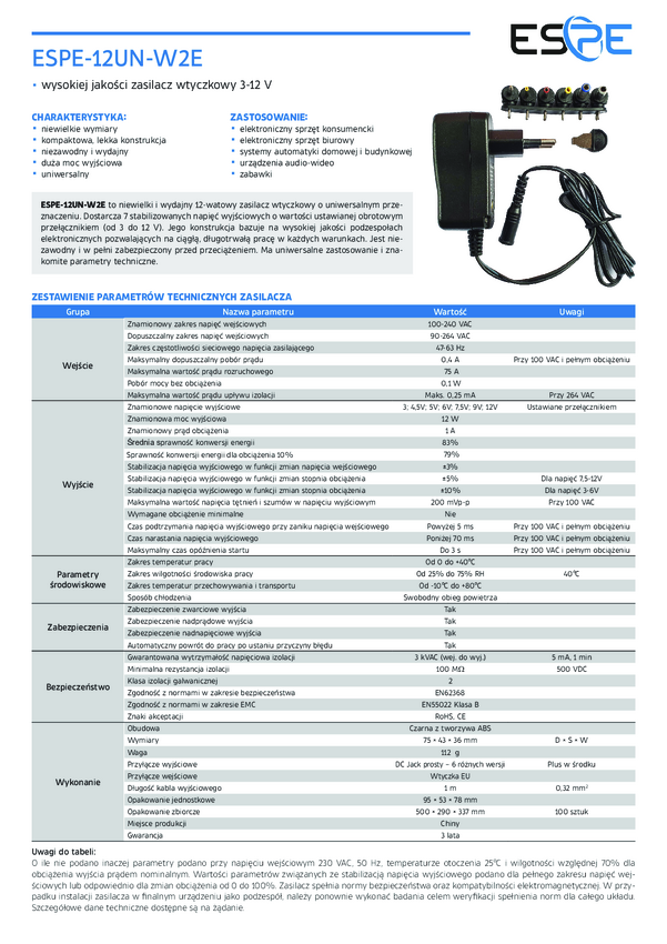 Zasilacz uniwersalny ESPE 3V 4.5V 5V 6V 7.5V 9V 12VDC 1000mA | ESPE-12UN-W2E-MP