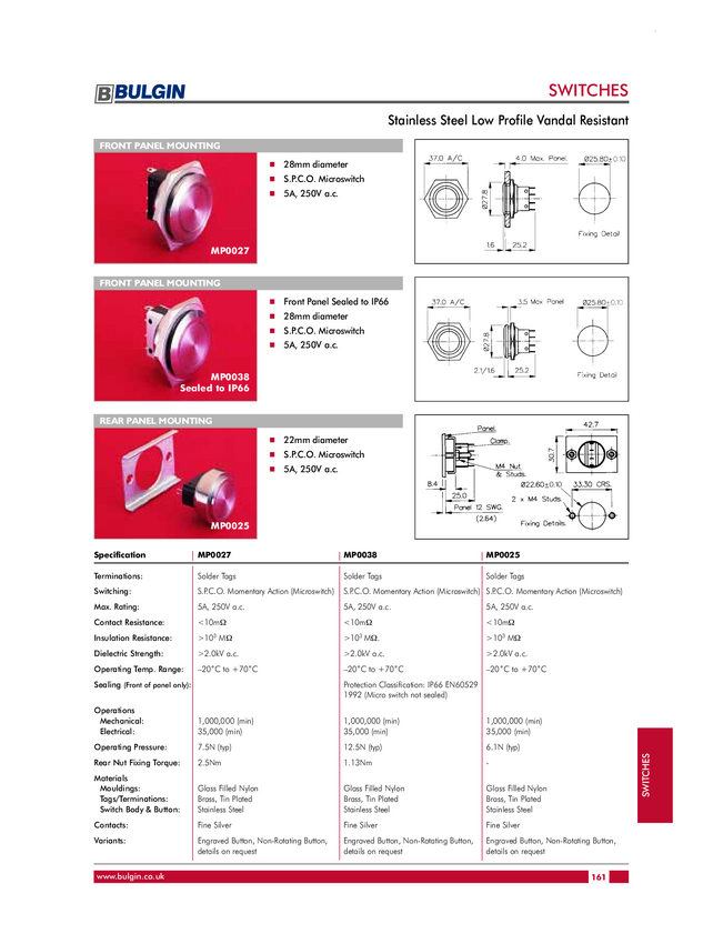 Przycisk wandaloodporny chwilowy Bulgin MP0038, 1 x wył/(wł), IP66 (uszczelniene płyty przedniej), 1 szt.