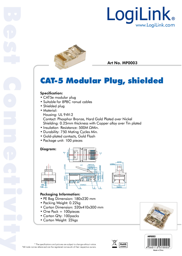 złącze męskie proste RJ45 LogiLink MP0003 Ilość styków: 8P8C 100 szt.