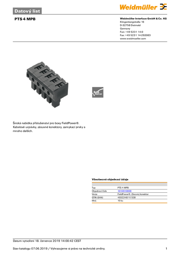 Weidmüller 1010910000 PTS 4 MPB Złącze męskie bezpiecznika elastyczny: 0.5-4 mm² stała: 0.5-4 mm² Ilość styków: 5 10 szt