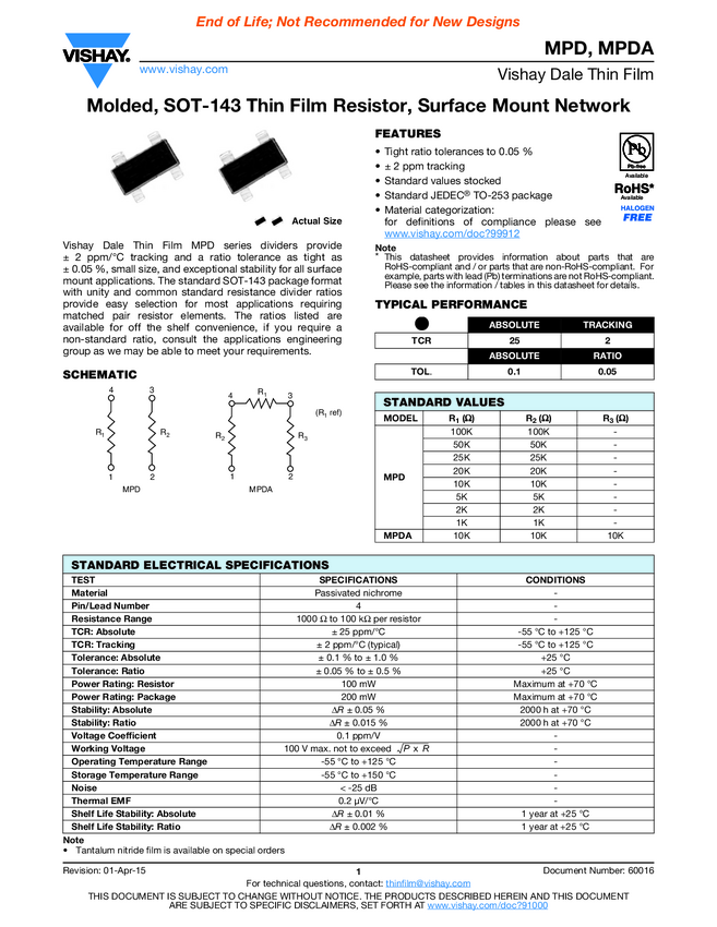Molded, SOT-143 Thin Film Resistor, Surface Mount Network