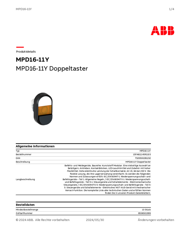 ABB 1SFA611145R1103 MPD16-11Y Przycisk podwójny czarny/biały 1 szt.