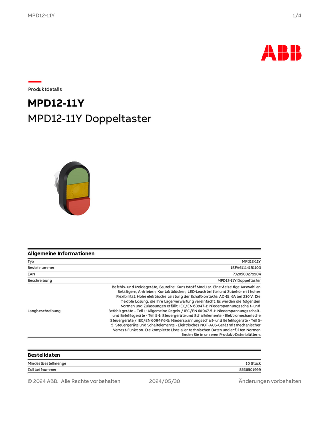 ABB 1SFA611141R1103 MPD12-11Y Przycisk podwójny czerwony, zielony 1 szt.