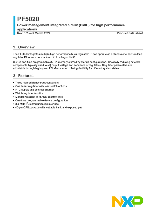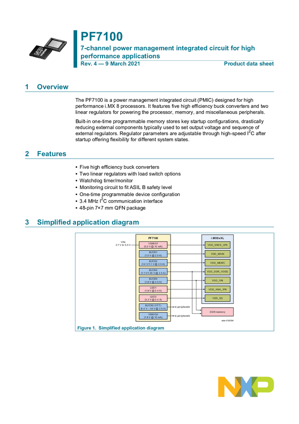 Power management IC, i.MX 8XL with lpDDR4, pre-prog, 5 buck, 2 LDO, Auto or Industrial, QM, grade 2, QFN 48