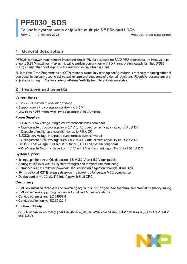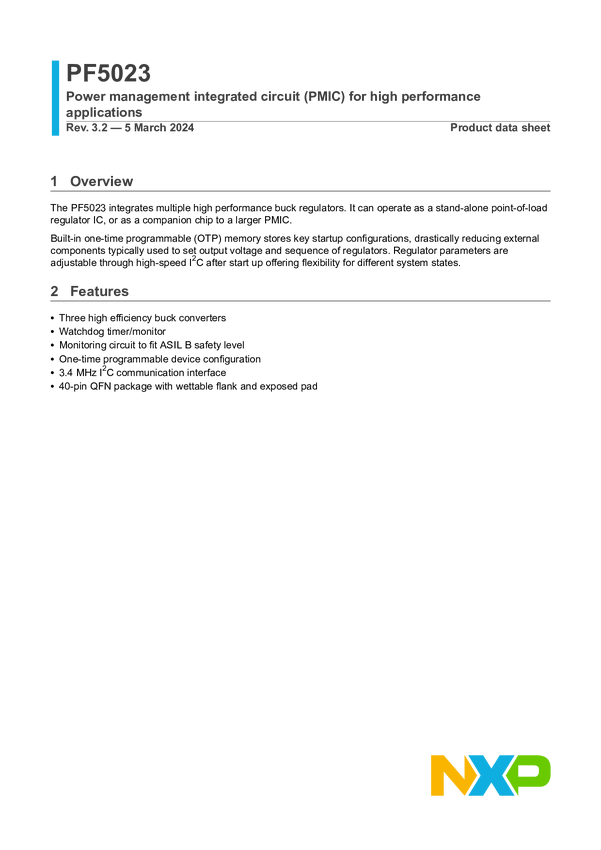Power management IC, S32Z2 (21x21 mm) with lpDDR4, S32E2, pre-prog, 3 buck, 2 LDO, Auto, QM, grade 1, QFN 40