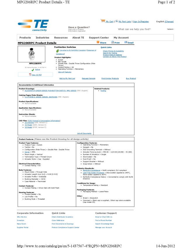 Switch Push Button DPDT Round Plunger 6A 250VAC Momentary Contact PC Pins Panel Mount/Through Hole Loose Piece
