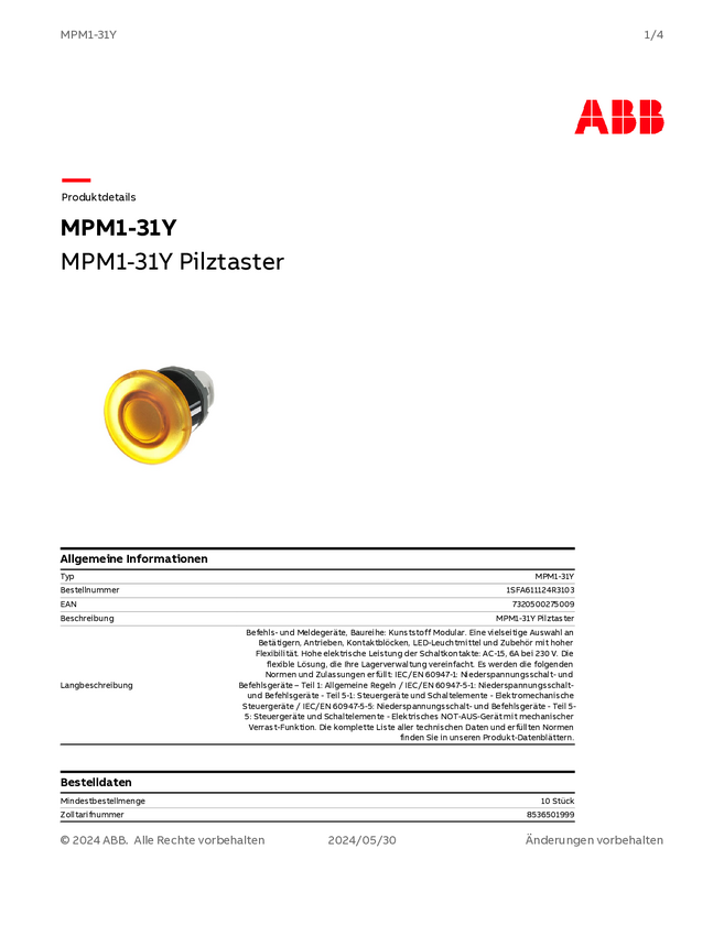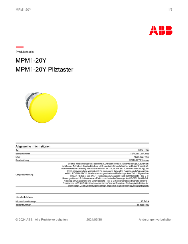 ABB 1SFA611124R3103 MPM1-31Y Podświetlany przycisk grzybkowy żółty 1 szt.