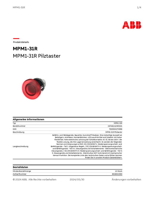 ABB 1SFA611124R3101 MPM1-31R Podświetlany przycisk grzybkowy czerwony 1 szt.