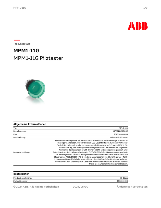 ABB 1SFA611124R1102 MPM1-11G Przycisk grzybkowy zielony 1 szt.