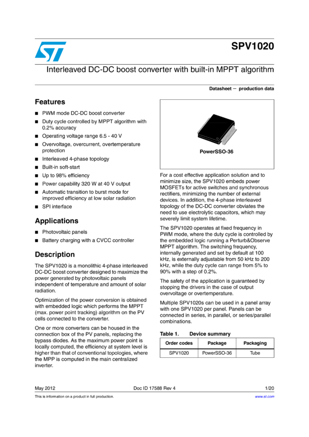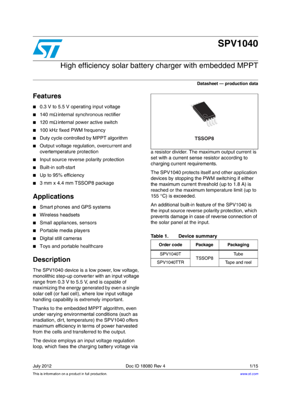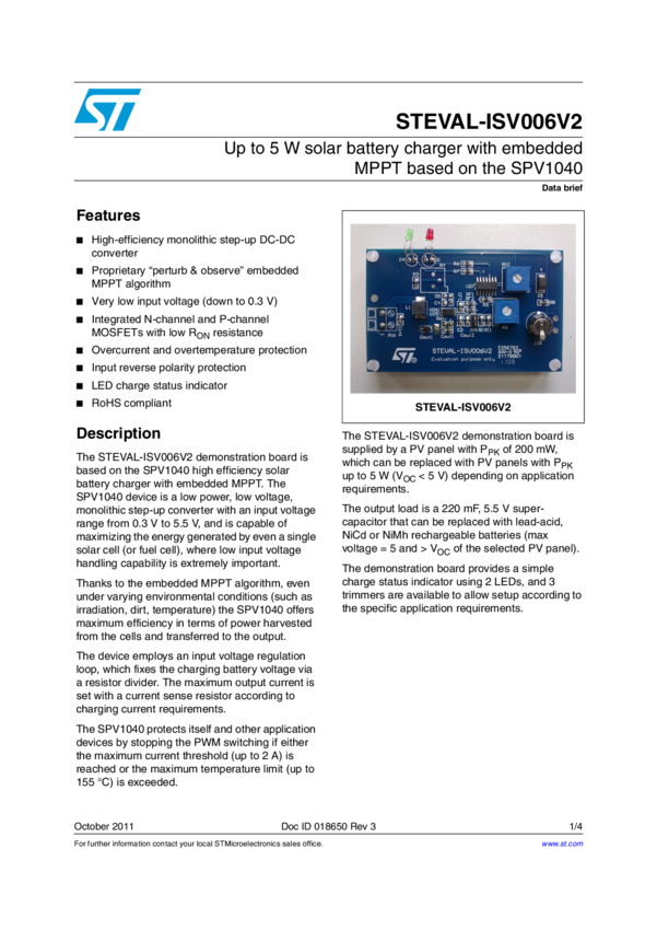 Up to 5 W solar battery charger with embedded MPPT based on SPV1040