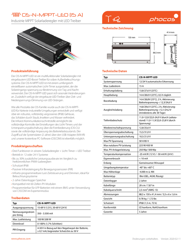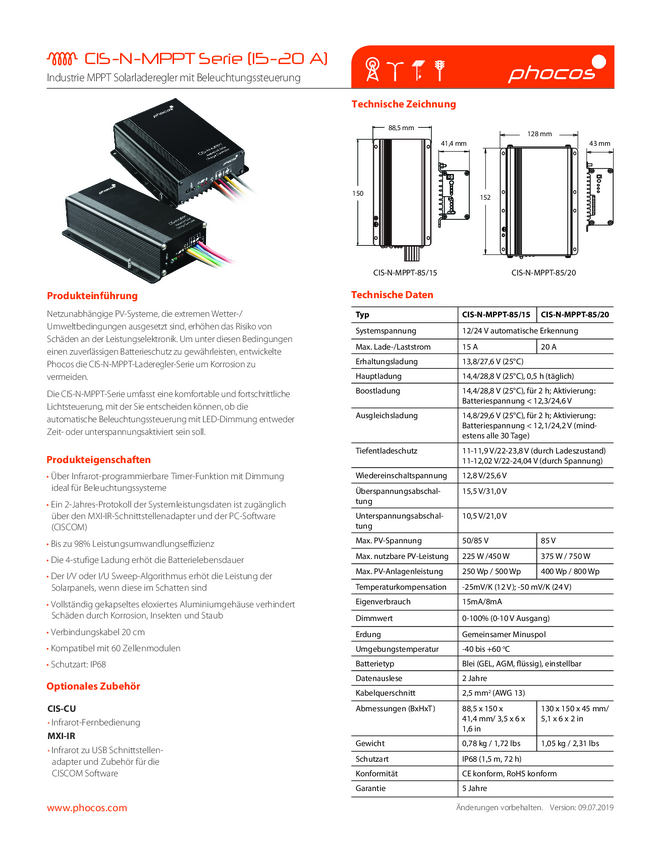 Solarny regulator ładowania Phocos CIS-N-MPPT 85/15 MPPT 12 V, 24 V 15 A