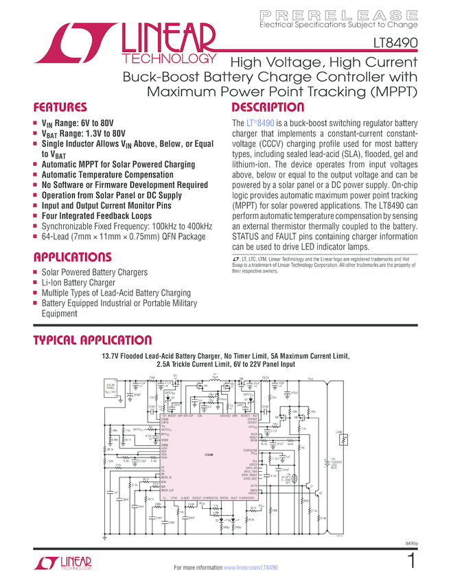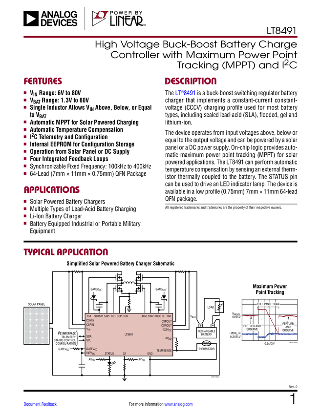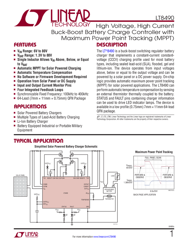 High Voltage, High Current Buck-Boost Battery Charge Controller with Maximum Power Point Tracking (MPPT)