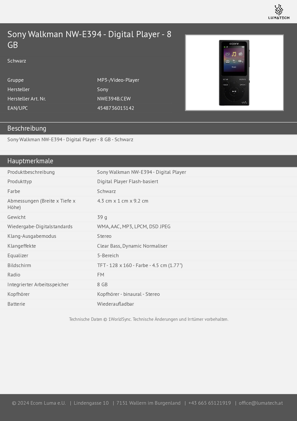 Odtwarzacz MPR3 Sony Walkman® NW-E394B