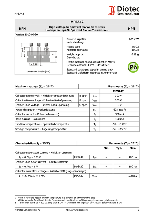 Tranzystor 2N Diotec Diotec MPSA42 NPN Rodzaj obudowy TO-92 N/A N/A