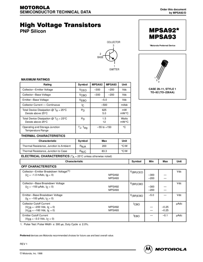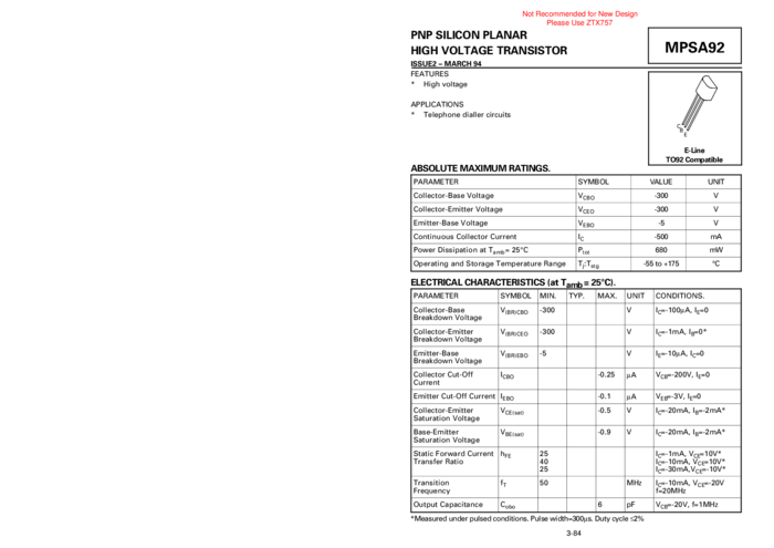 Vce 300V, Ic 500mA, PNP High Voltage Transistor, TO-92