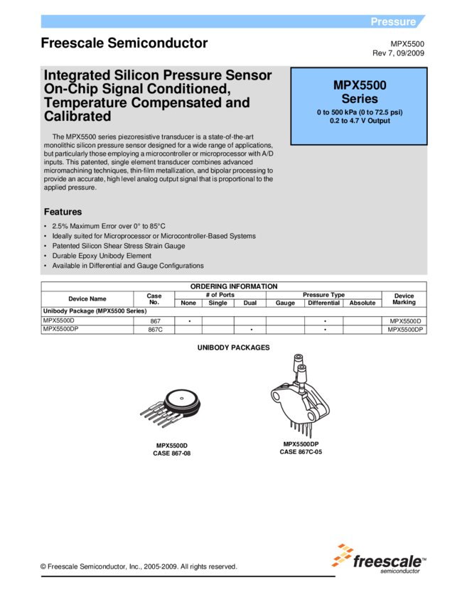 MPX5500 Integrated Silicon Pressure Sensor On-Chip Signal Conditioned, Temperature Compensated and Calibrated