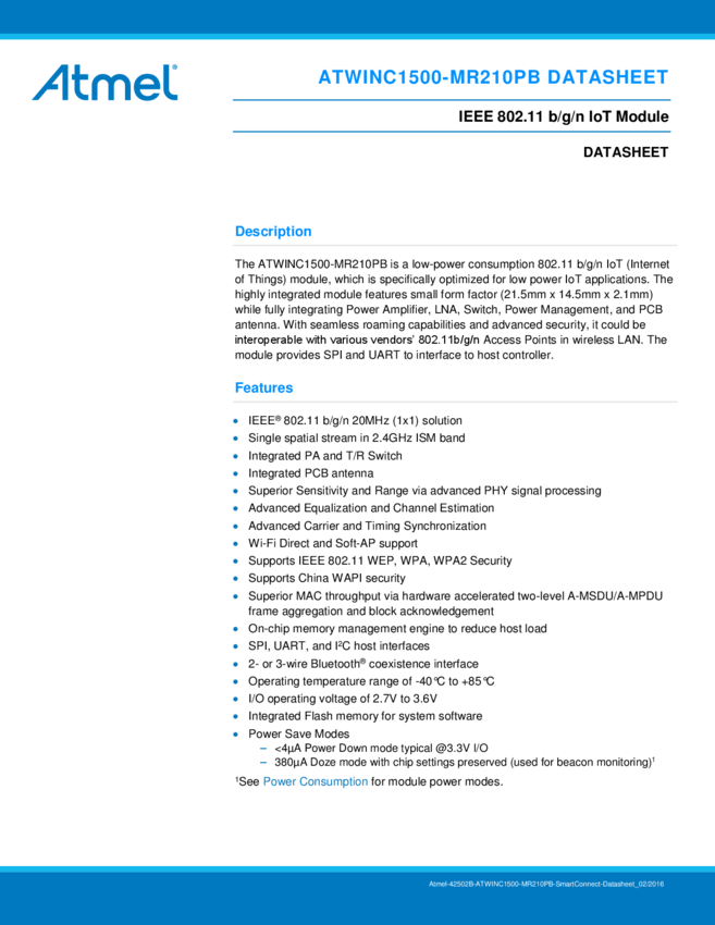 ATWINC15x0-MR210xB IEEE 802.11 b/g/n SmartConnect IoT Module