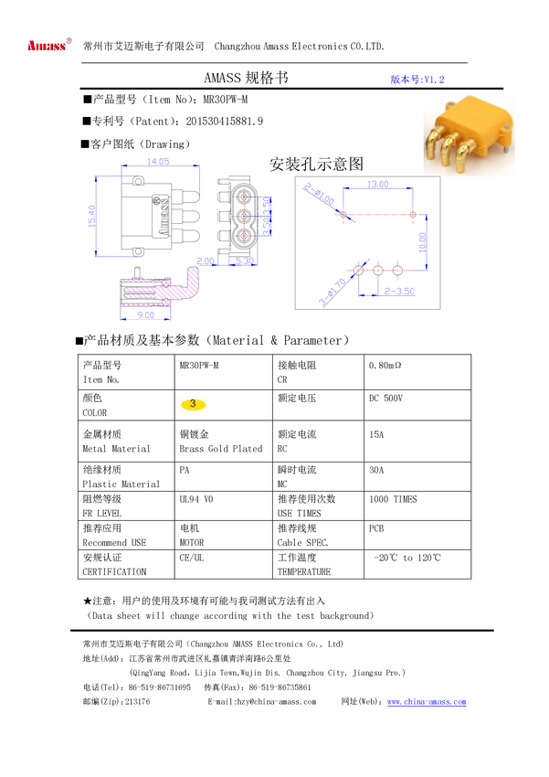 Złącze zasilające; gniazdo; MR30PW-FB; żeńskie; na PCB; THT; 30A; 500V; 3 pin; kątowe; MR30PW-FB; AMASS; RoHS