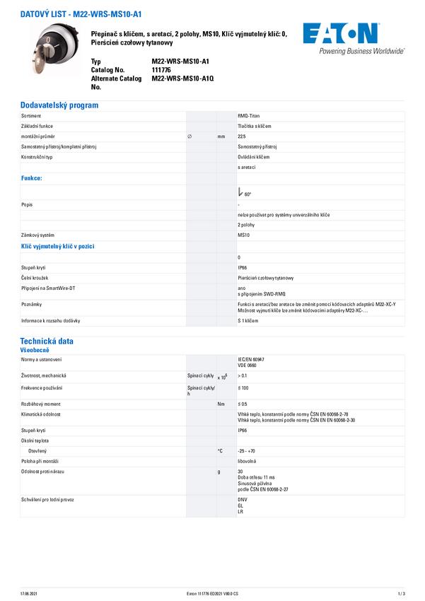 Eaton 111776 M22-WRS-MS10-A1 Przycisk kluczykowy pierścień przedni z tworzywa sztucznego klucz czarny 1 szt.