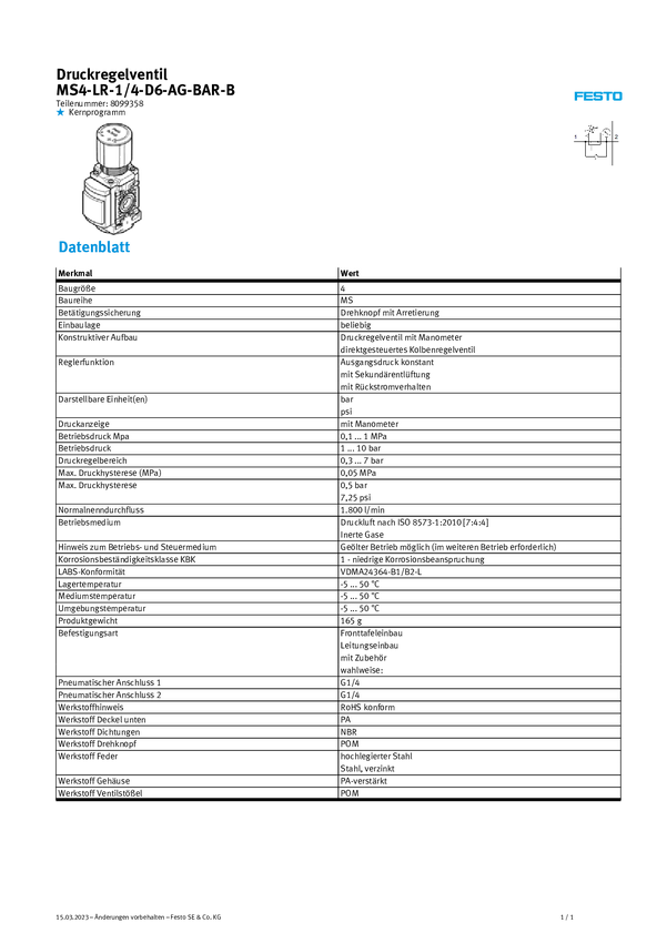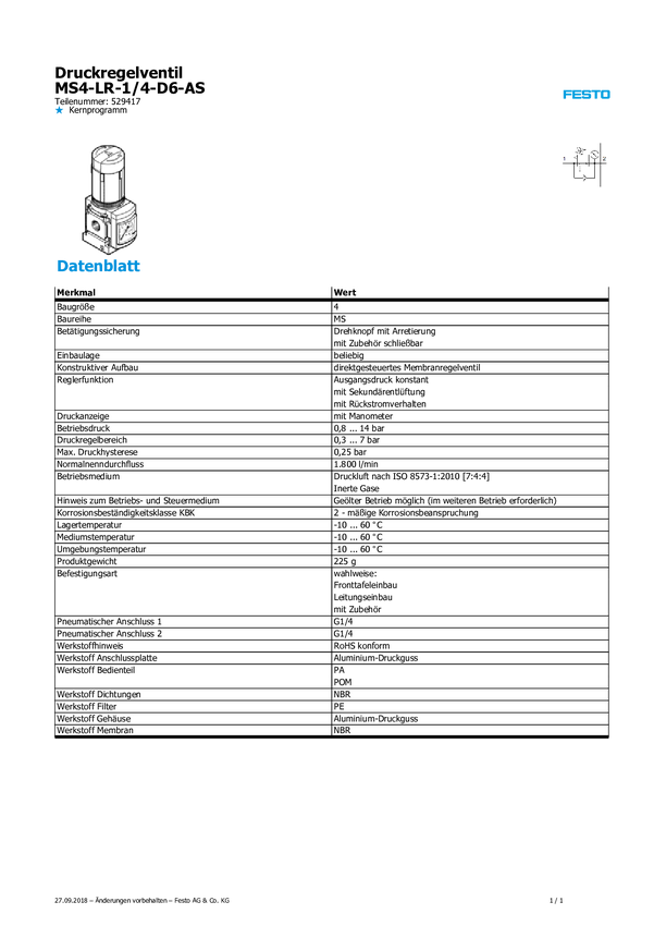 Zawór regulacyjny FESTO MS4-LR-1/4-D6-AS 529417, 0.8 do 14 bar