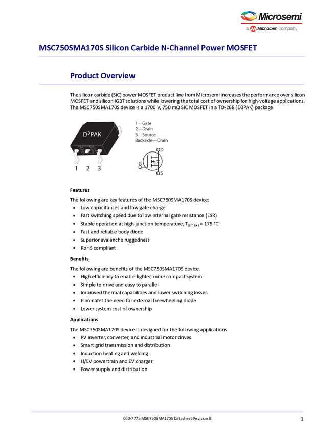 MSC750SMA170SA 1700V, 750 mOhm mSiC™ MOSFET TO-263 Datasheet