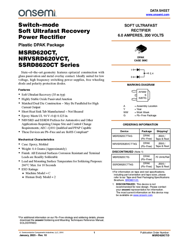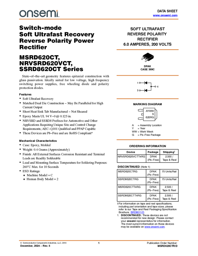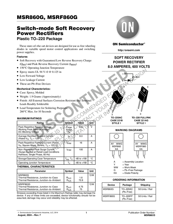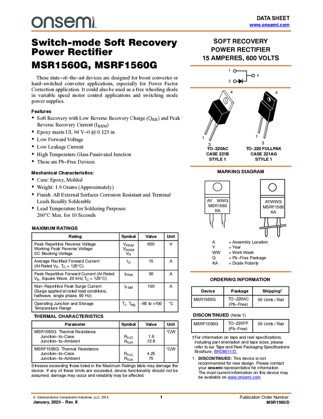 Power Rectifier, Soft Recovery, Switch-mode, 8 A, 600 V