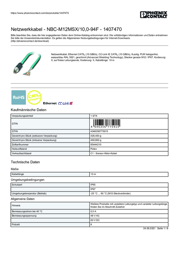 Phoenix Contact 1407470 Kabel połączeniowy czujnika/aktuatora NBC-MSX/10,0-94F SCO, piny: 8, 10.00 m, 1 szt.