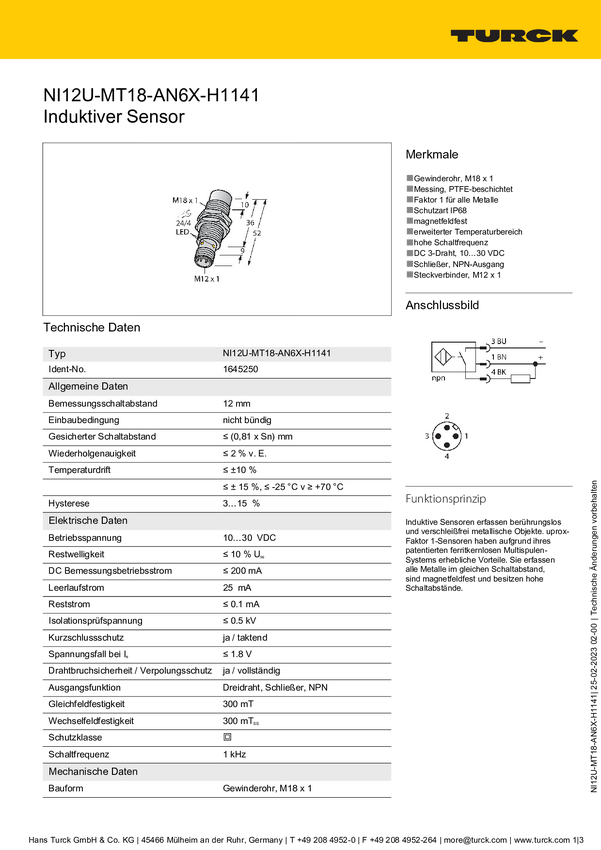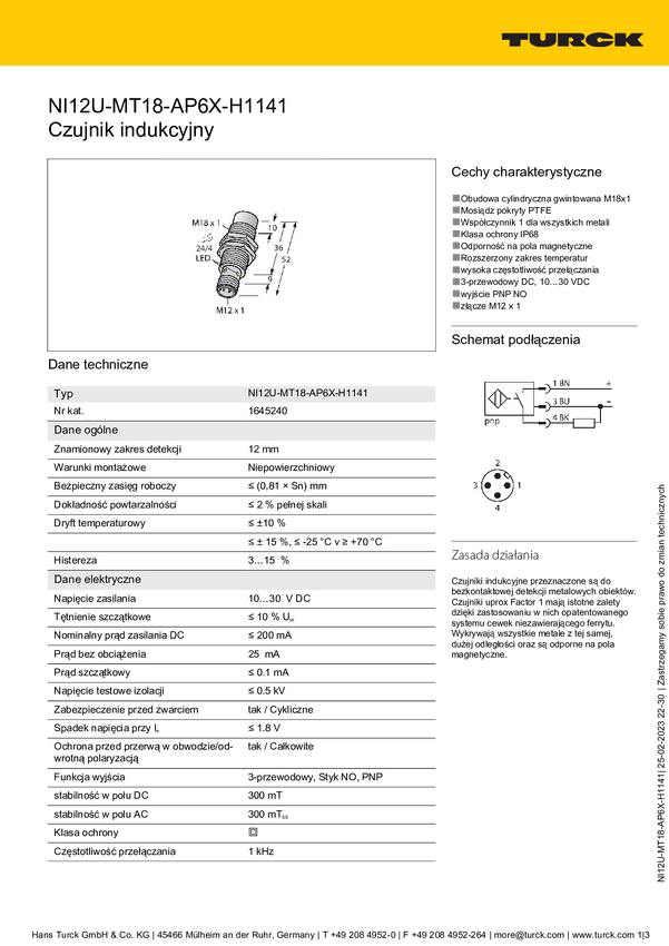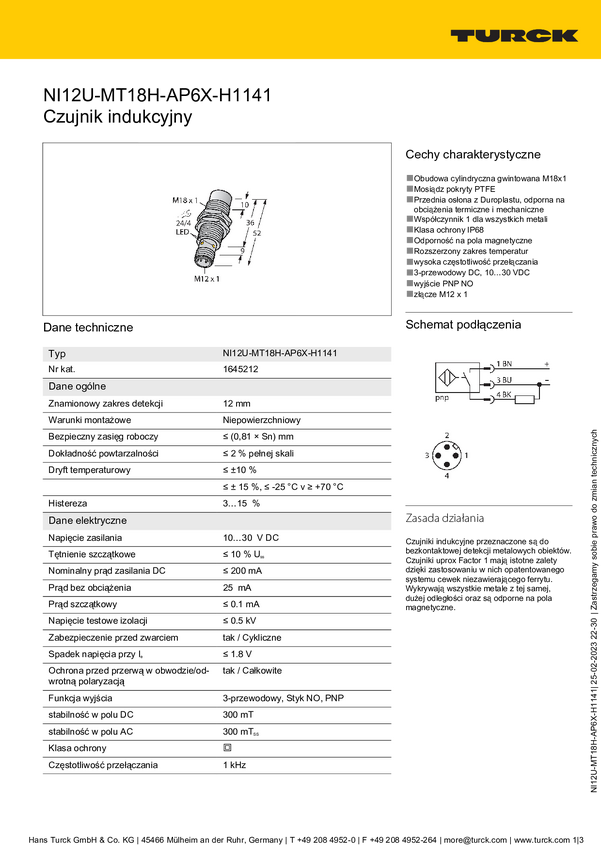 Turck Czujnik indukcyjny nie podtynkowy PNP, Zamykający NI12U-MT18H-AP6X-H1141