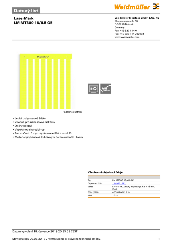 Weidmüller 1749321687 LM MT300 18X6,5 GE Drukarka systemu etykietującego Sposób montażu: przyklejanie Pole powierzchni e