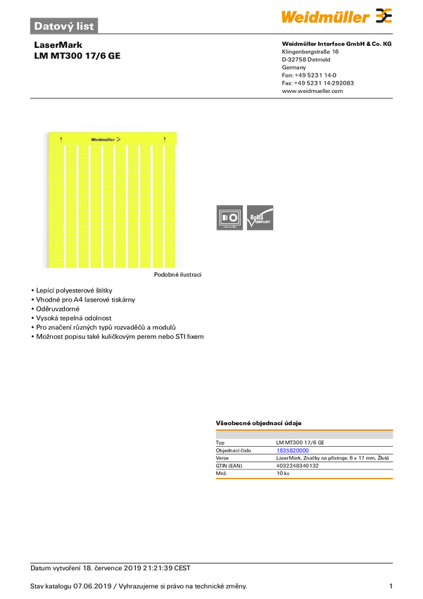 Weidmüller 1835830000 LM MT300 19.05X6.3 GE Drukarka systemu etykietującego Sposób montażu: przyklejanie Pole powierzchn