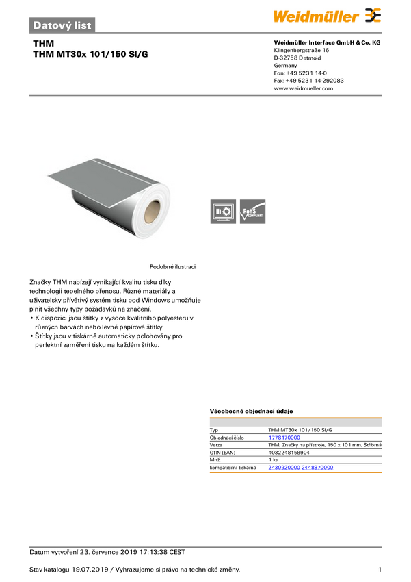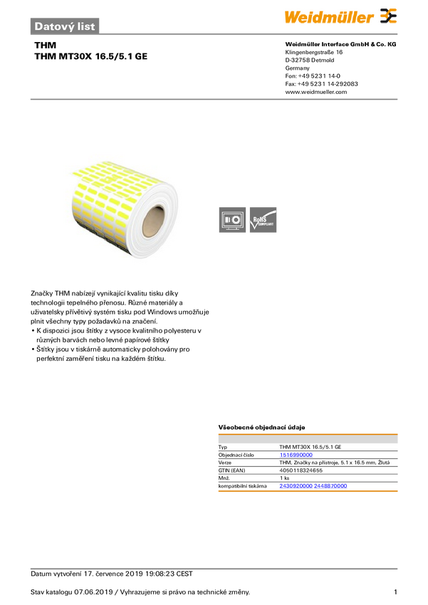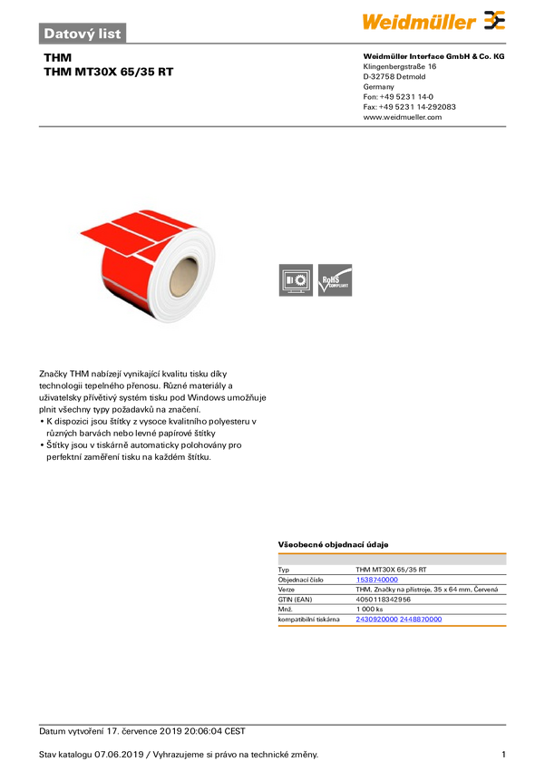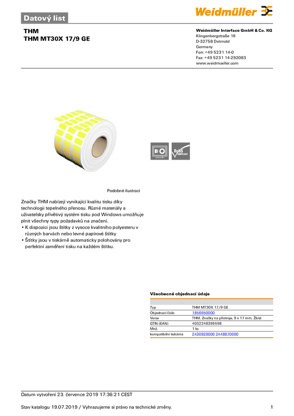 Weidmüller 1856650000 THM MT30X 17/9 GE/M Drukarka systemu etykietującego Sposób montażu: przyklejanie Pole powierzchni