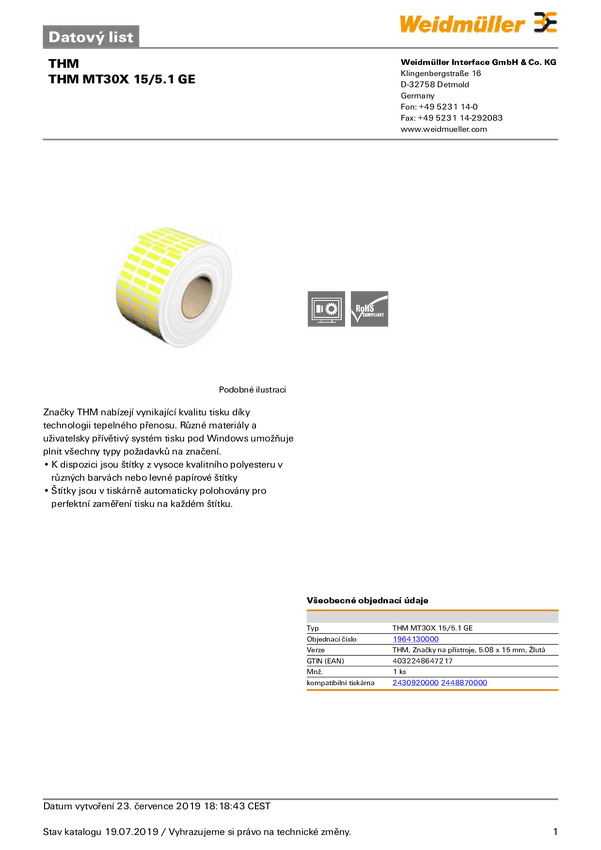Weidmüller 1964130000 THM MT30X 15/5,08 GE Drukarka systemu etykietującego Sposób montażu: przyklejanie Pole powierzchni