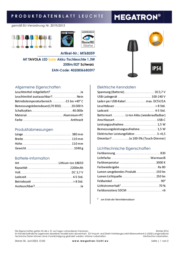Akumulatorowa lampka stołowa Megatron TAVOLA Solar MT68059 2 W czarny 200 lm