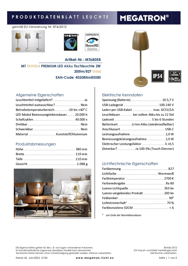 Akumulatorowa lampka stołowa Megatron TAVOLA MT68058 2 W złoty 200 lm