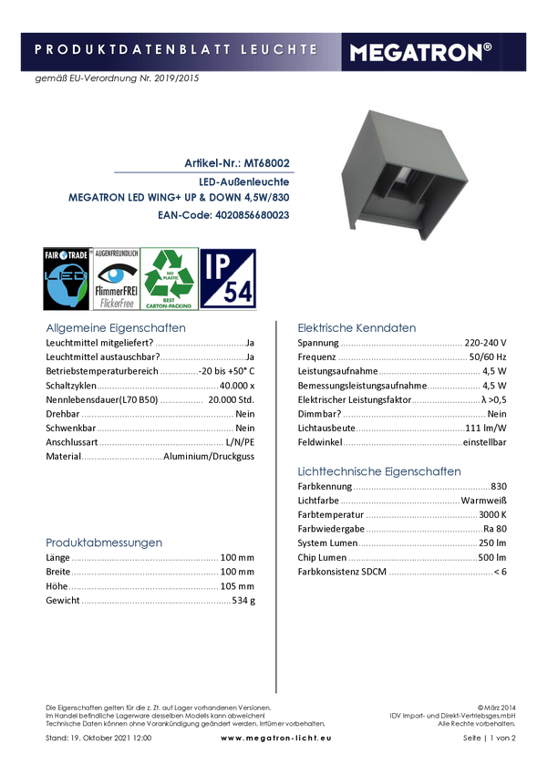 Zewnętrzna lampa ścienna Megatron MT68002 4.5 W IP54