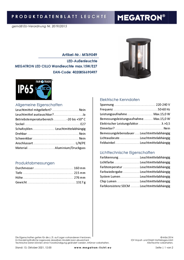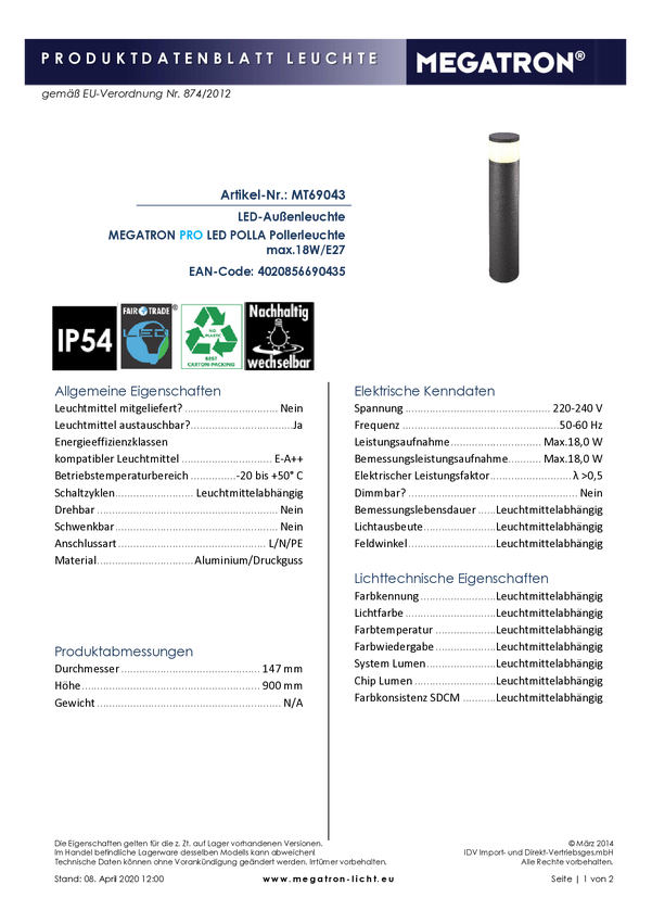 Zewnętrzna lampa ścienna Megatron RUNO Rund MT69045 IP54