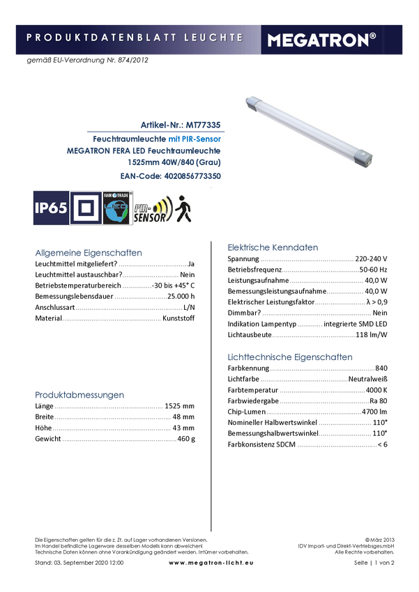 Megatron Fera Lampa LED do wilgotnych pomieszczeń z czujnikiem ruchu LED LED wbudowany na stałe 40 W biały szary