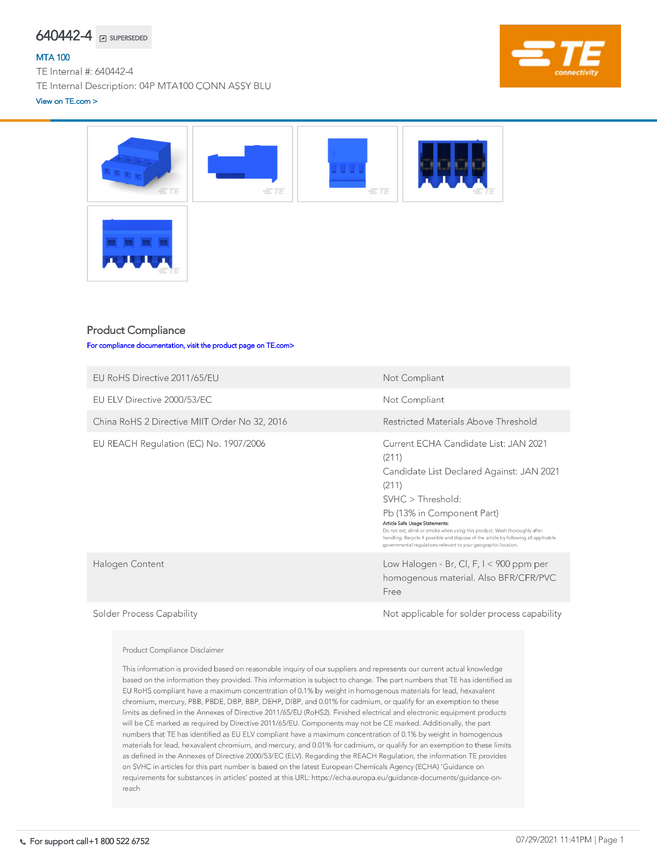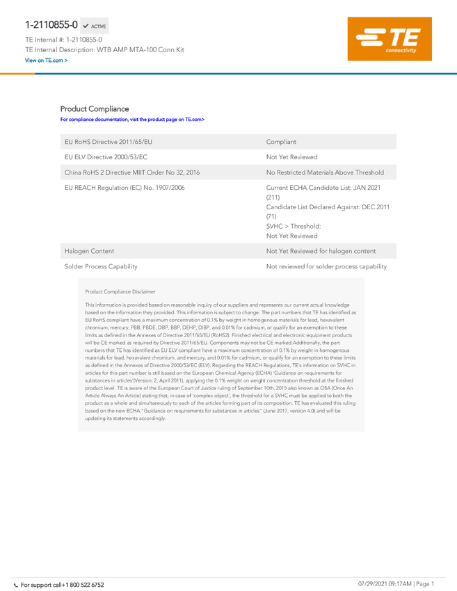 TE Connectivity 2110855-1 TE AMP MTA-100 CL Connectors, 1 szt.