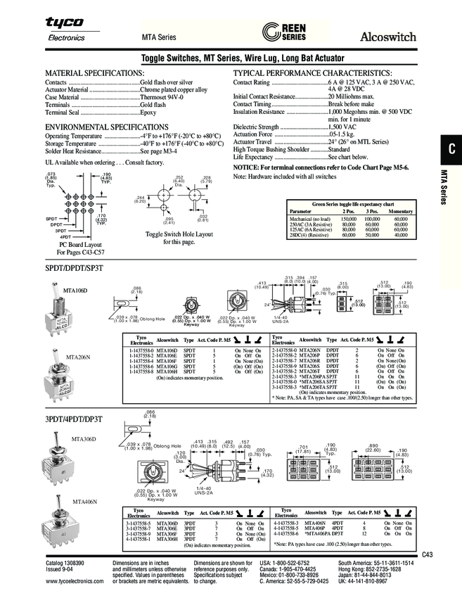 Switch Toggle ON ON SPST Bat Toggle PC Pins 6A 125VAC 6VDC Panel/Thru-Hole