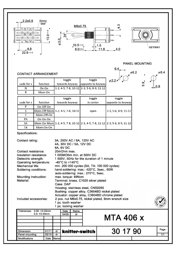 Switch Toggle (ON) OFF (ON) DPDT Short Toggle Wire Lug 6A 250VAC 28VDC Panel Mount with Threads