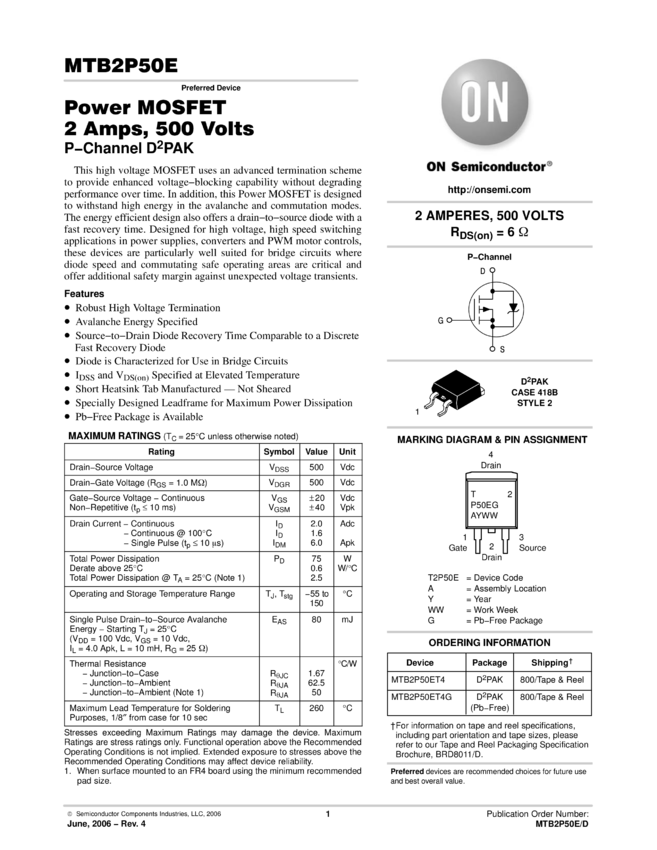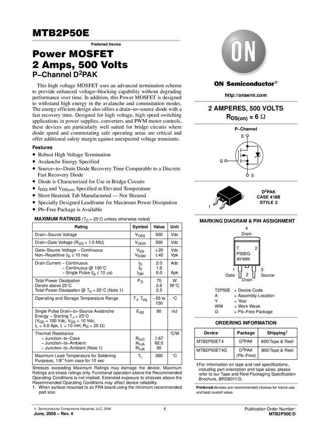 Power MOSFET -500V -2A 6 Ohm Single P-Channel D2PAK