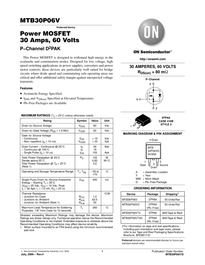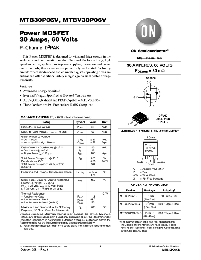 Power MOSFET -60V -30A 80 mOhm Single P-Channel D2PAK